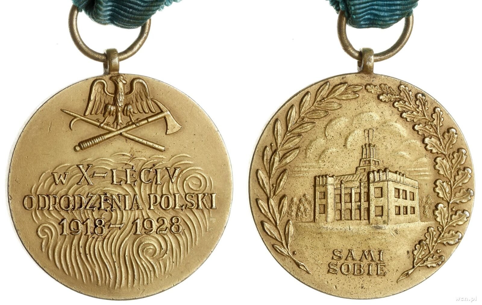 Na medalu strażackim X-lecia odzyskania niepodległości widnieje budynek Domu Strażackiego. Medal ustanowił w 1928 r. Zarząd Główny Związku Straży Pożarnych RP w Warszawie. Medal upamiętniał odzyskanie przez Polską niepodległości. Miał też inny cel. Prawo do noszenia medalu nabywali strażacy, którzy przesłużyli 3 lata (medal brązowy), 5 lat (srebrny) i 10 lat (złoty). Wraz z medalem