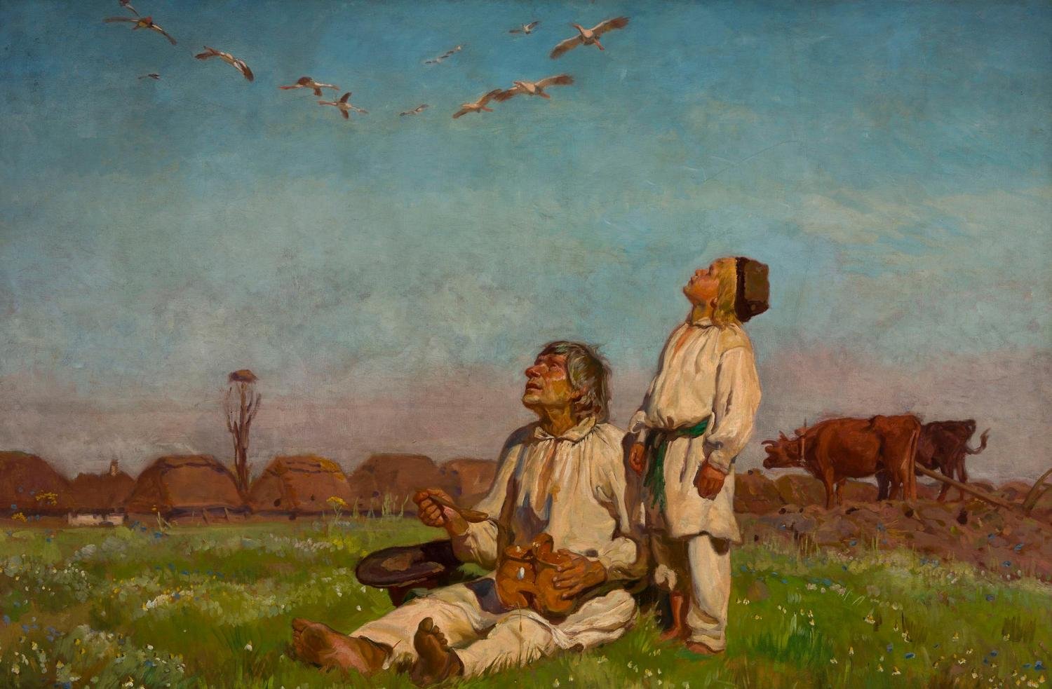 4 Chłopi w białych sukmanach na obrazie Józefa Chełmońskiego pt. „Bociany”
