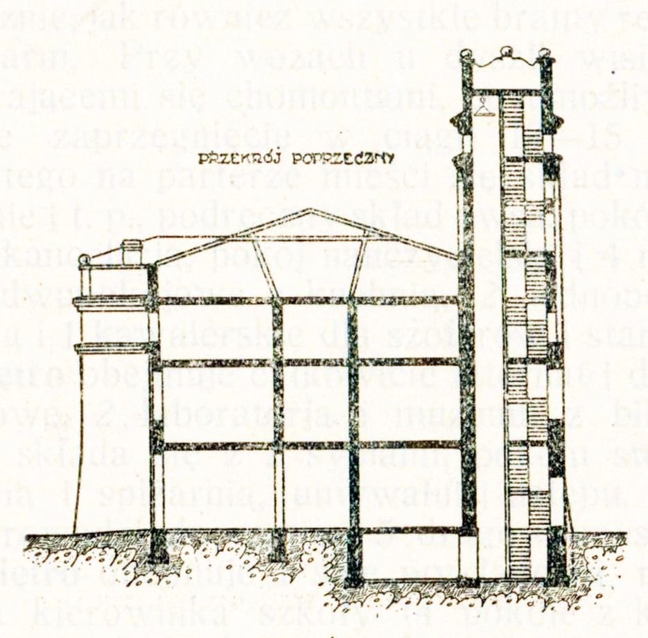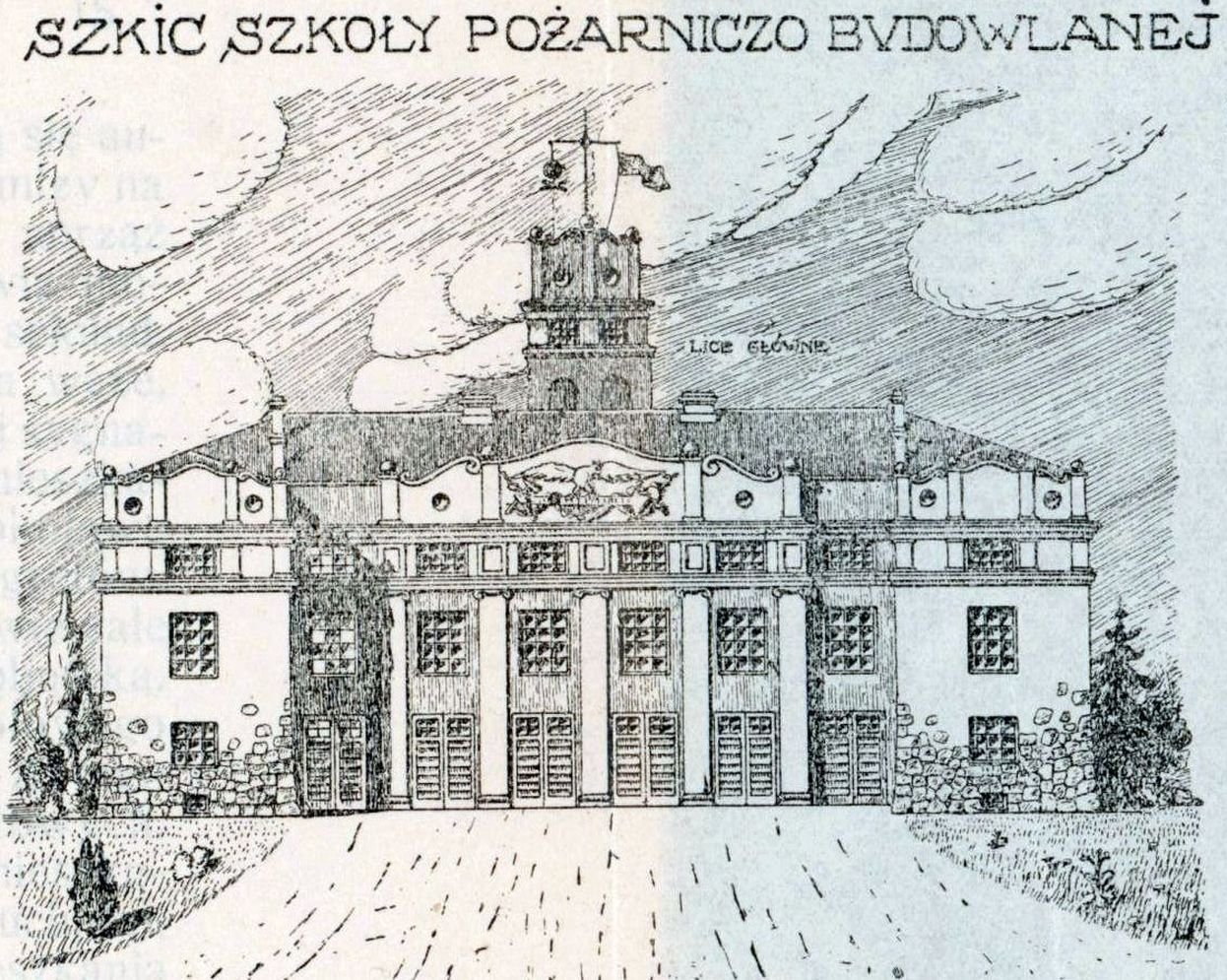 Okazały gamach szkolny miał pełnić jednocześnie funkcje remizy wraz z internatem, salami wykładowymi, mieszkaniem dla dyrektora i kadry pedagogicznej. Na parterze miały parkować w przyszłości 3 samochody strażackie i 3 wozy konne (stajnie, skład owsa). Na pierwszym piętrze planowano urządzić internat, pracownie specjalistyczne, muzeum pożarnictwa i bibliotekę. Na drugim piętrze sale wykładowe i mieszkania dla personelu. W piwnicach planowano urządzić laboratorium hydrotechniczne, chemiczne i pralnię węży. Do budynku przylegać miała wspinalnia.