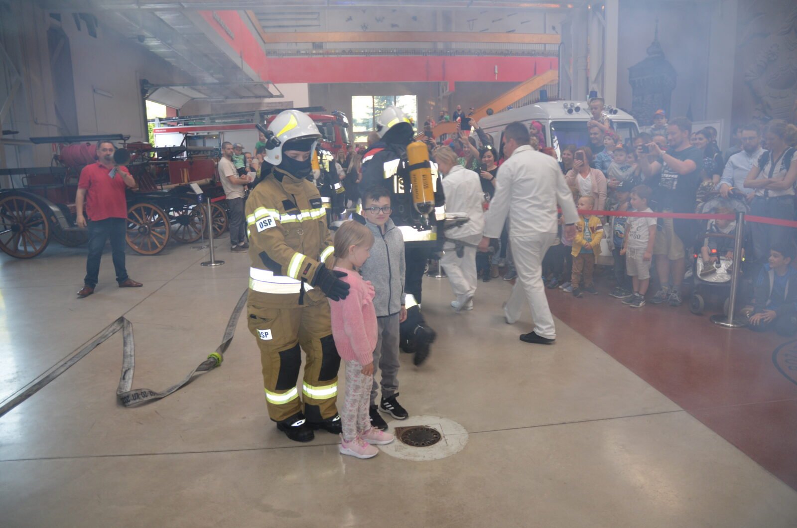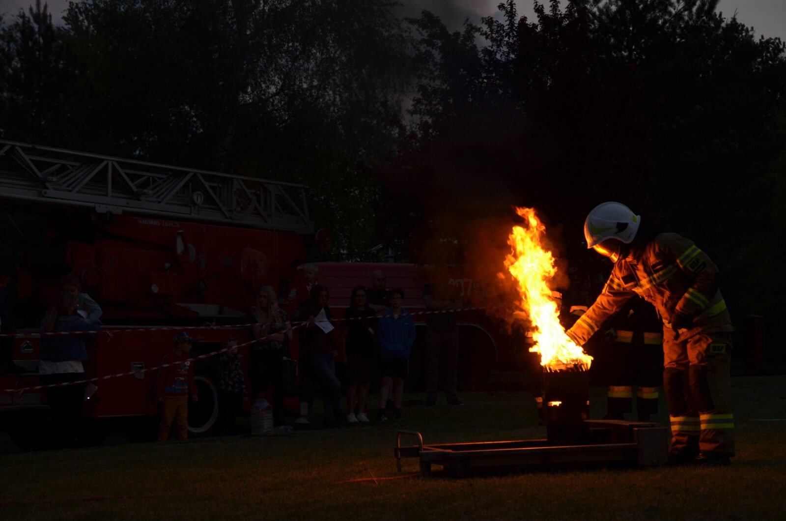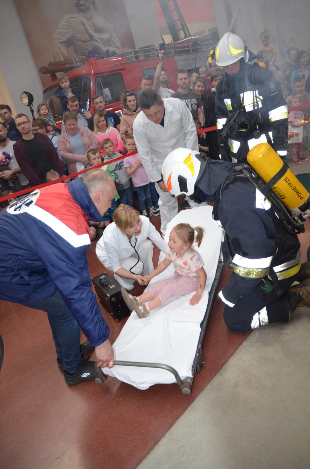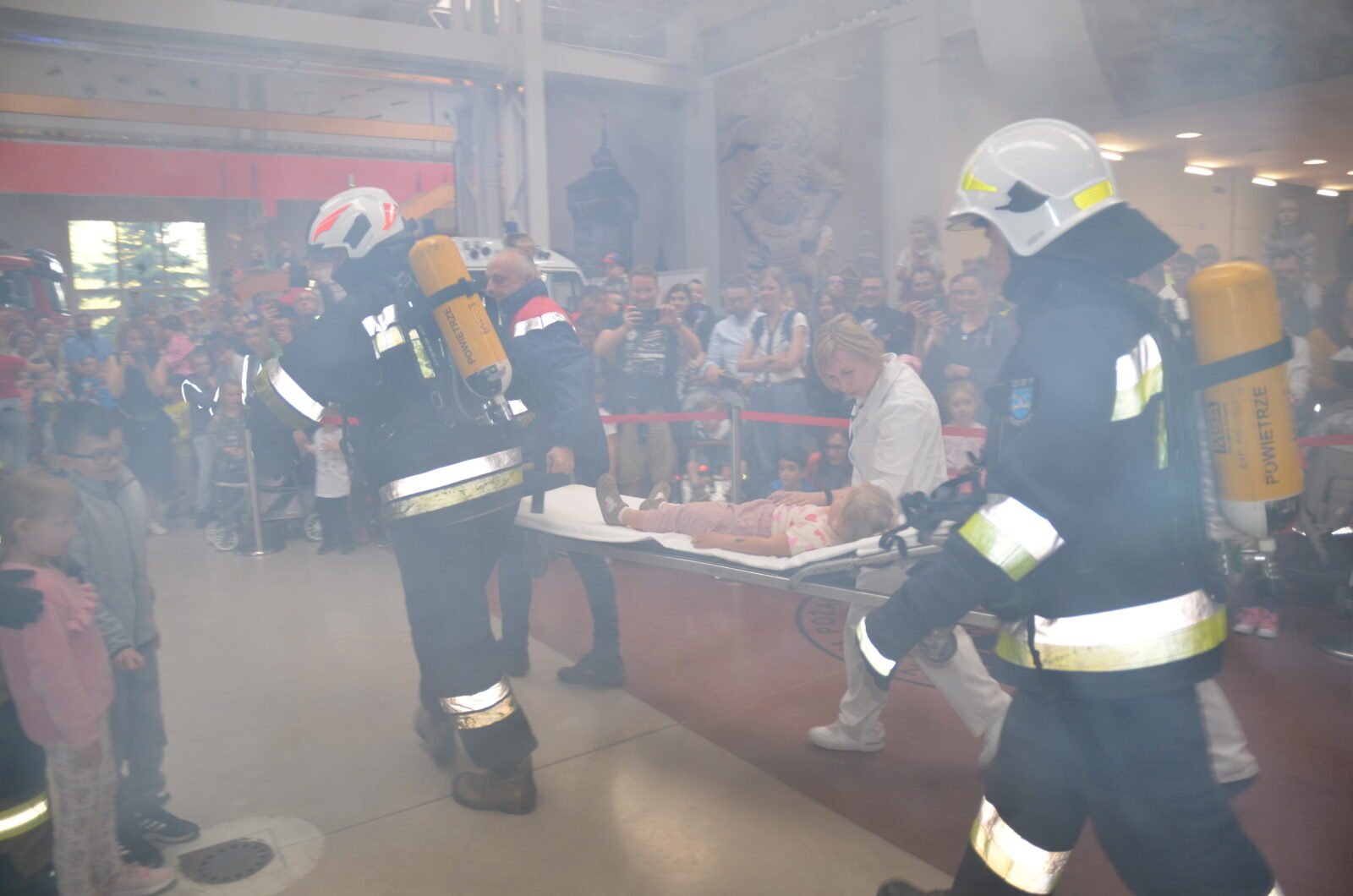 O godzinie 19.00 odbył się pokaz akcji ratowniczej uwięzionych dzieci w budynku mieszkalnym. W domu wybuchł pożar, gęsty dym spowodował uruchomienie się alarmu. Do akcji przystąpili strażacy z OSP Kosztowy. Dzięki sprawnemu działaniu udało się uratować wszystkich najmłodszych. W międzyczasie ratownicy medyczni prowadzili czynności kontrolne stanu zdrowia poszkodowanych. Ciężko rannych kierowano do karetki pogotowia.